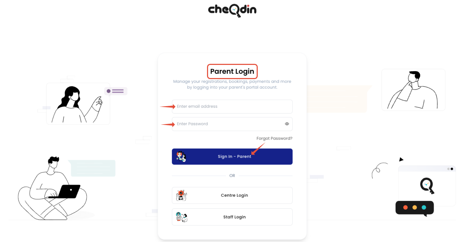 - Login into your parents portal account by visiting the link: https://cheqdin.com/login/parent