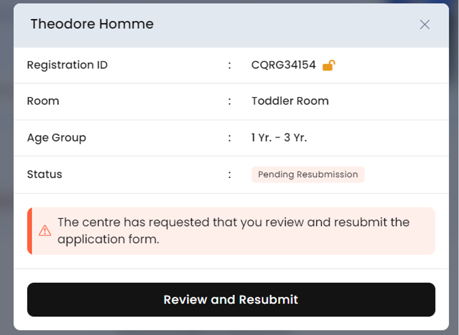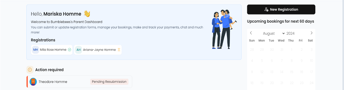 Step 2: Once signed into your account, you will see an action required prompt, with your child’s registration form showing as pending resubmission. Once you click on this, it will open your child’s registration form.