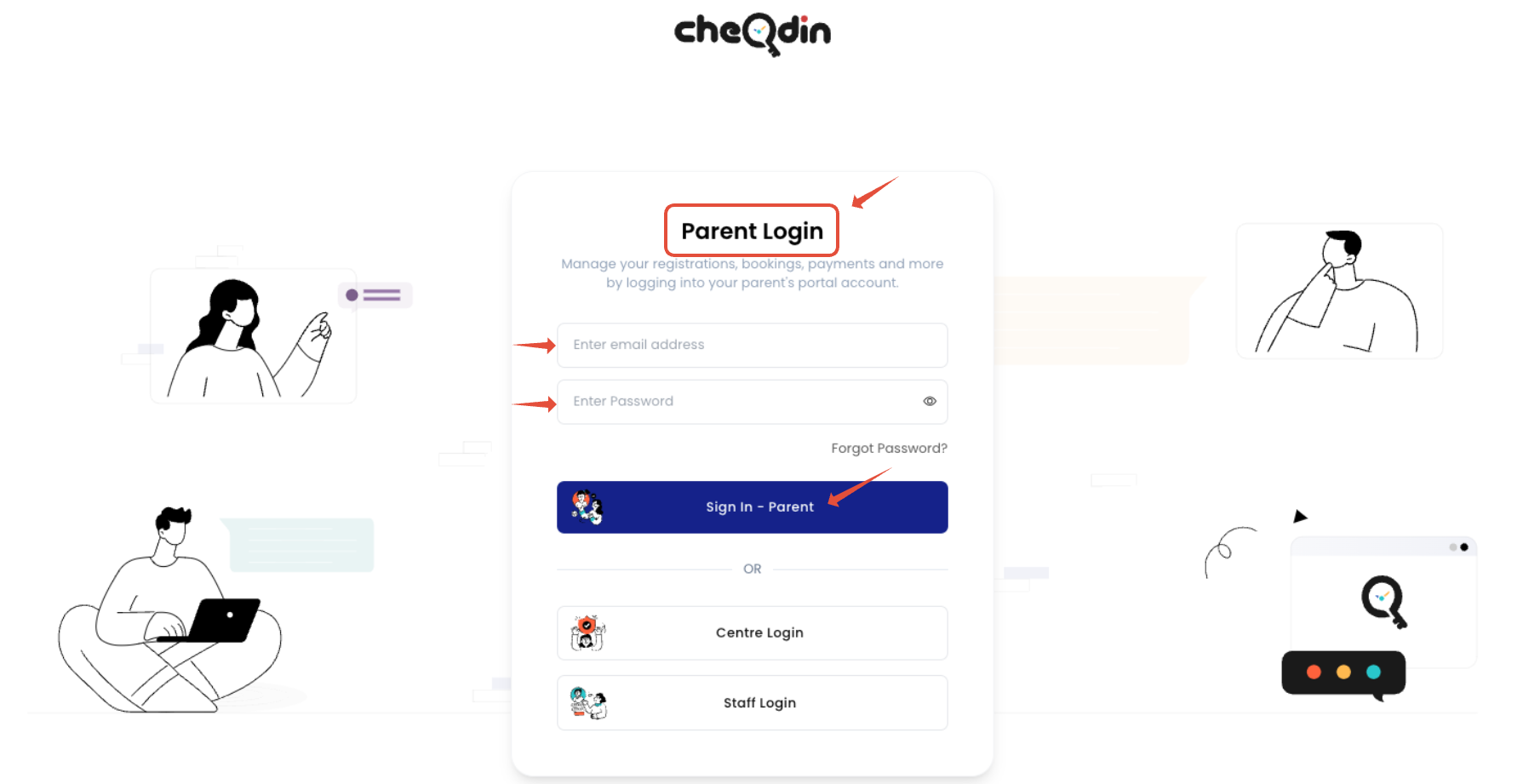 Step 1: Please sign into your parent’s portal account, ensuring that you select the parent login option. Here's the parents portal link: https://cheqdin.com/login/parent